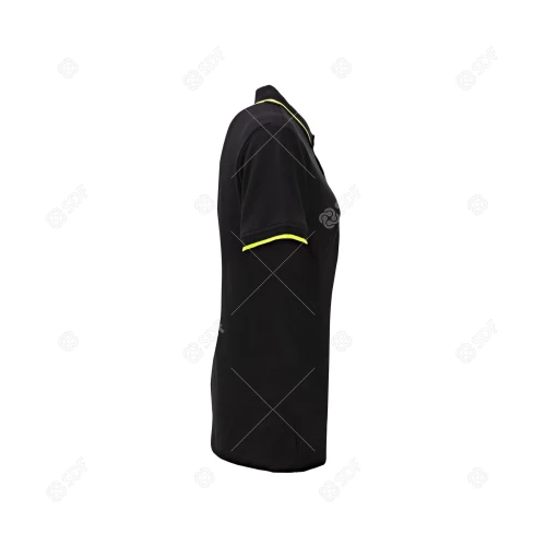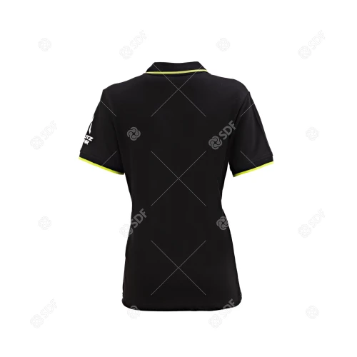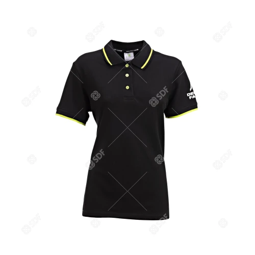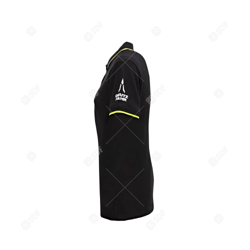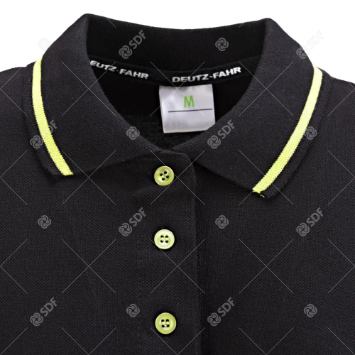 Denne svarte DEUTZ-FAHR-poloskjorten med korte ermer for kvinner er laget av 100 % piquébomull og er både elegant og avslappet. Den kontrasterende grønne kanten på kragen og ermene gir et originalt preg. Knappene, også i kontrastfarge, sikrer et særegent utseende. Merkegrafikk på venstre erme og halskant. Disse detaljene gjør dette plagget til et allsidig og stilig valg.
