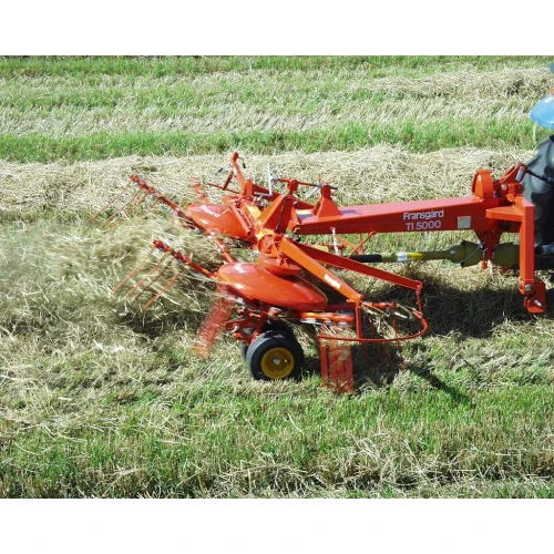 TI-5000-riven har 2 rotorer med 6 armer på hver – alle utstyrt med nylonhjul. De lukkede kulelagrene i kurveføringen krever ingen smøring. Armene er enkle å ta av via det fjærbelastede håndtaket når de skal omplasseres for de ulike arbeidsfunksjonene. Når du bytter fra riving til midten og over til riving til siden, endres rotasjonsretningen til venstre rotor. Det er viktig at nylonhjulet i kurveføringen dreies 180°. Modellen roterer mellom oppheng og bom, som låses automatisk når maskinen løftes. Ved transport på vei dreies maskinen manuelt bak traktoren.