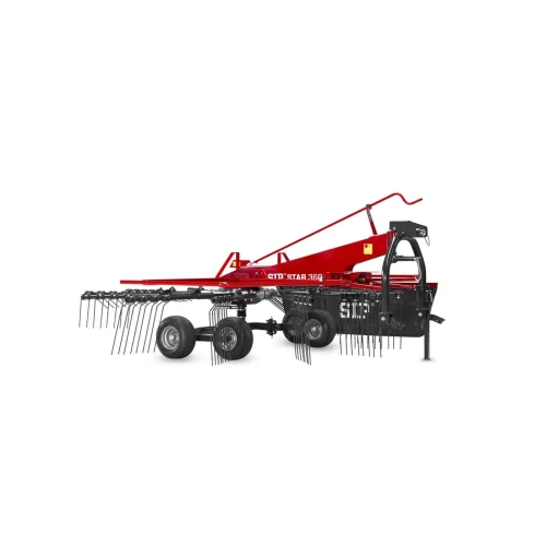 SIP Star 360/10 er en 1-rotors-rive med gjennomtenkt konstruksjon og egenskaper som typisk finnes på de større 2-rotors-rivene. Modulære rotorer der armene kan skiftes enkeltvis, stor rotordiameter som krever mindre moment og kraft, justerbar eksenterbane som lar deg bestemme tindenes slipp-punkt og patenterte tandemaksler er eksempler på dette. De fire doble fjærtindene på holderen sørger for jevne og rene skår og med svingbar kobling er de ekstremt smidige, følger traktoren optimalt og har en liten snusirkel. De tilpasser seg perfekt til terreng og muliggjør profesjonell raking selv i ulendt terreng.
