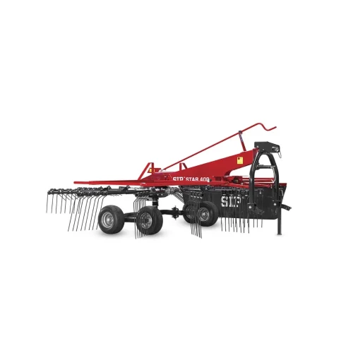 SIP Star 400/11 er en 1-rotors-rive med gjennomtenkt konstruksjon og egenskaper som typisk finnes på de større 2-rotors-rivene. Modulære rotorer der armene kan skiftes enkeltvis, stor rotordiameter som krever mindre moment og kraft, justerbar eksenterbane som lar deg bestemme tindenes slipp-punkt og patenterte tandemaksler er eksempler på dette. De fire doble fjærtindene på holderen sørger for jevne og rene skår og med svingbar kobling er de ekstremt smidige, følger traktoren optimalt og har en liten snusirkel. De tilpasser seg perfekt til terreng og muliggjør profesjonell raking selv i ulendt terreng.