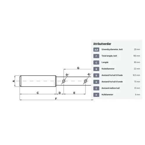F. Total lengde, bolt 180 mm